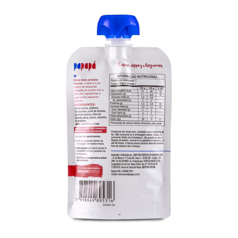 Feita apenas com ingredientes naturais, nossa Papinha de carne, arroz e legumes é uma refeição completa que contém os 4 principais grupos alimentares (proteína, cereais/grãos, vegetais e gordura), ela é perfeita para momentos onde você precisa de praticidade e não quer abrir mão da qualidade na alimentação do seu bebê! Além disso, ela é: